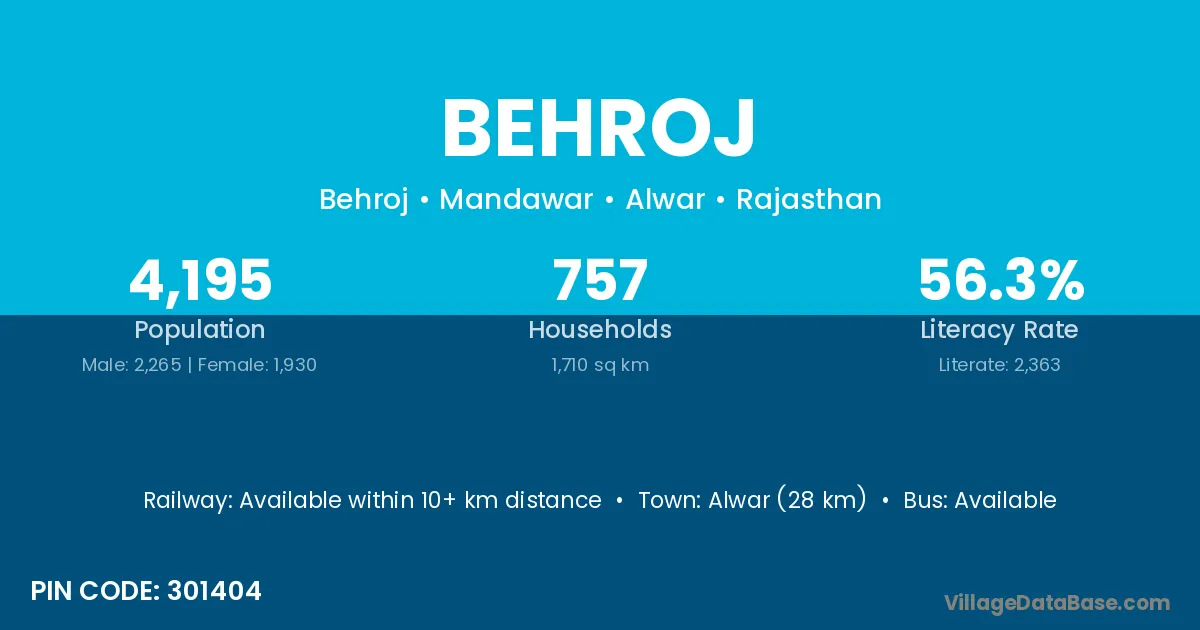 Alwar (28 km) is the nearest town to Behroj village for major economic activities and is located approximately 28 km away.