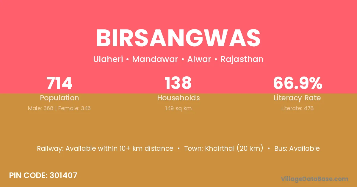 Khairthal (20 km) is the nearest town to Birsangwas village for major economic activities and is located approximately 20 km away.