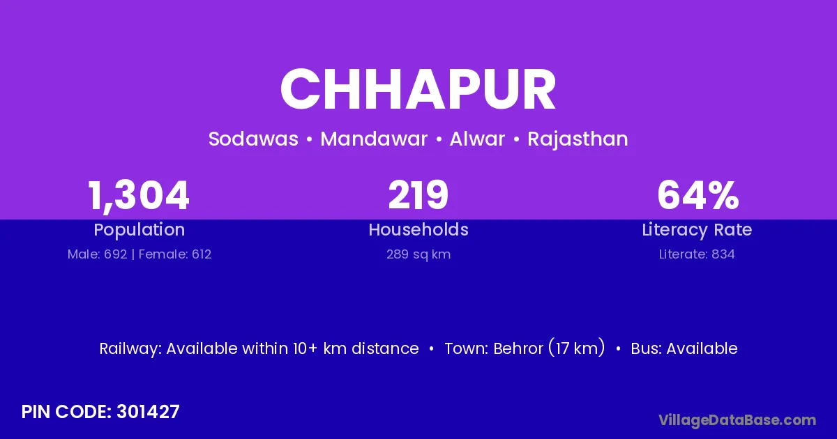 Behror (17 km) is the nearest town to Chhapur village for major economic activities and is located approximately 17 km away.