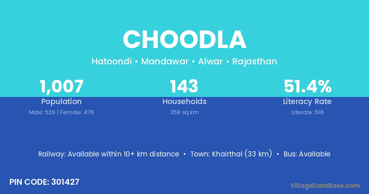 Khairthal (33 km) is the nearest town to Choodla village for major economic activities and is located approximately 33 km away.