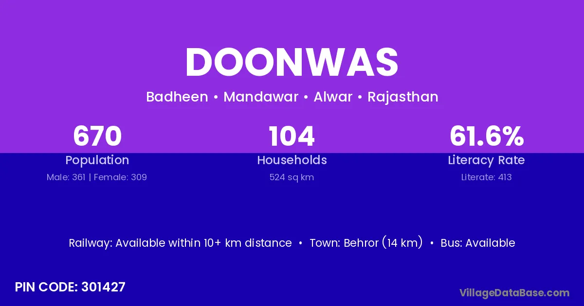 Behror (14 km) is the nearest town to Doonwas village for major economic activities and is located approximately 14 km away.