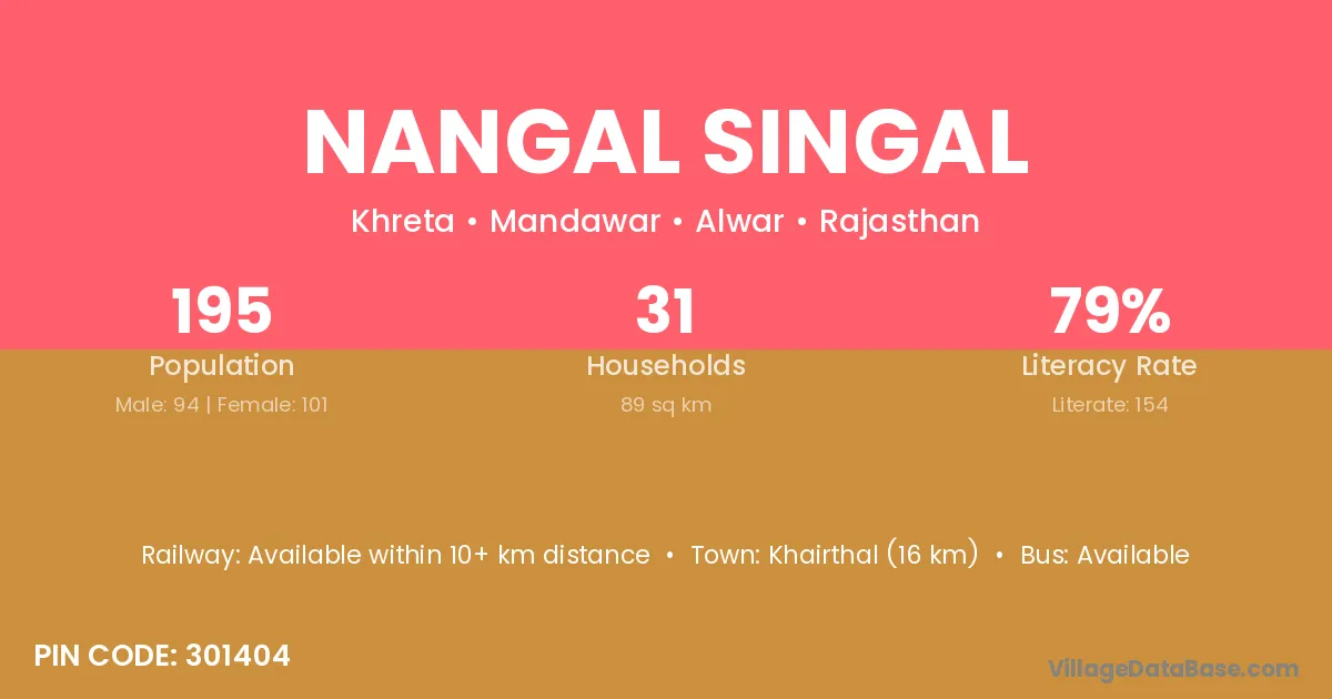Khairthal (16 km) is the nearest town to Nangal Singal village for major economic activities and is located approximately 16 km away.