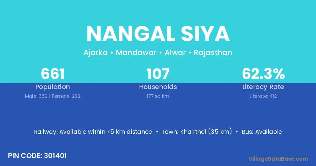 Khairthal (35 km) is the nearest town to Nangal Siya village for major economic activities and is located approximately 35 km away.