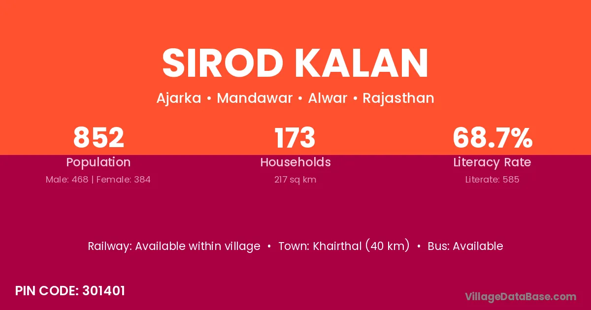 Khairthal (40 km) is the nearest town to Sirod Kalan village for major economic activities and is located approximately 40 km away.