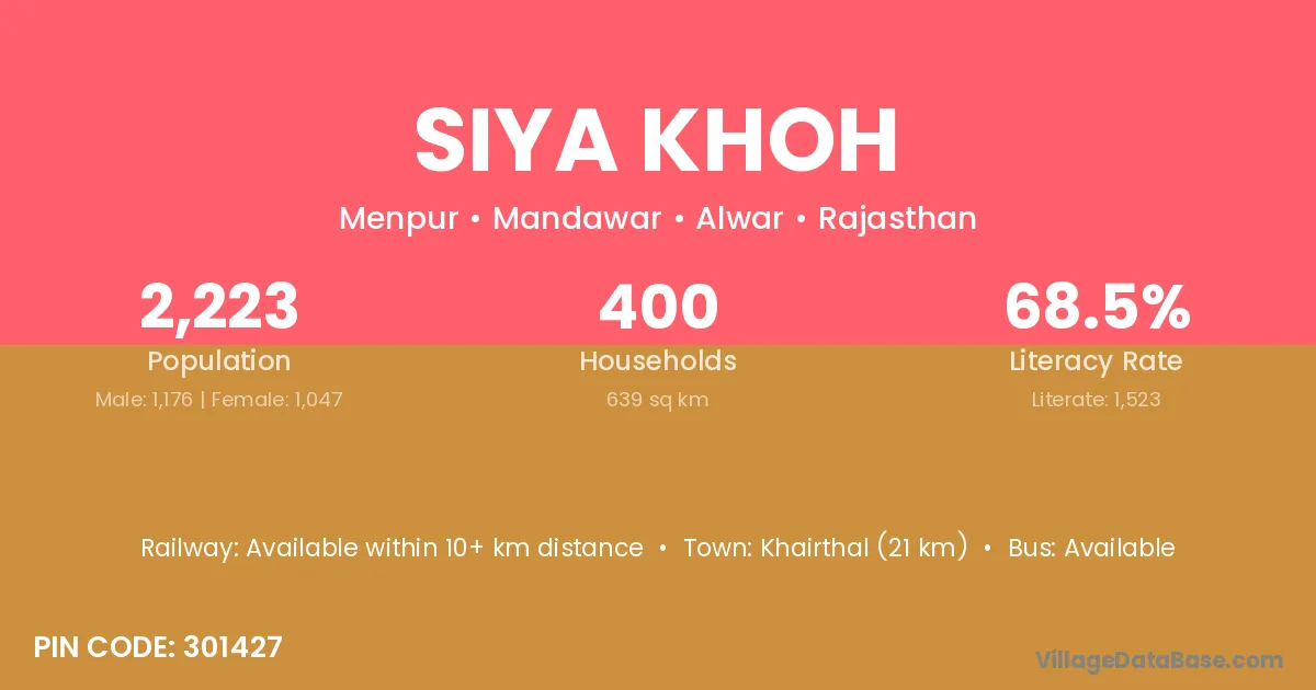 Khairthal (21 km) is the nearest town to Siya Khoh village for major economic activities and is located approximately 21 km away.