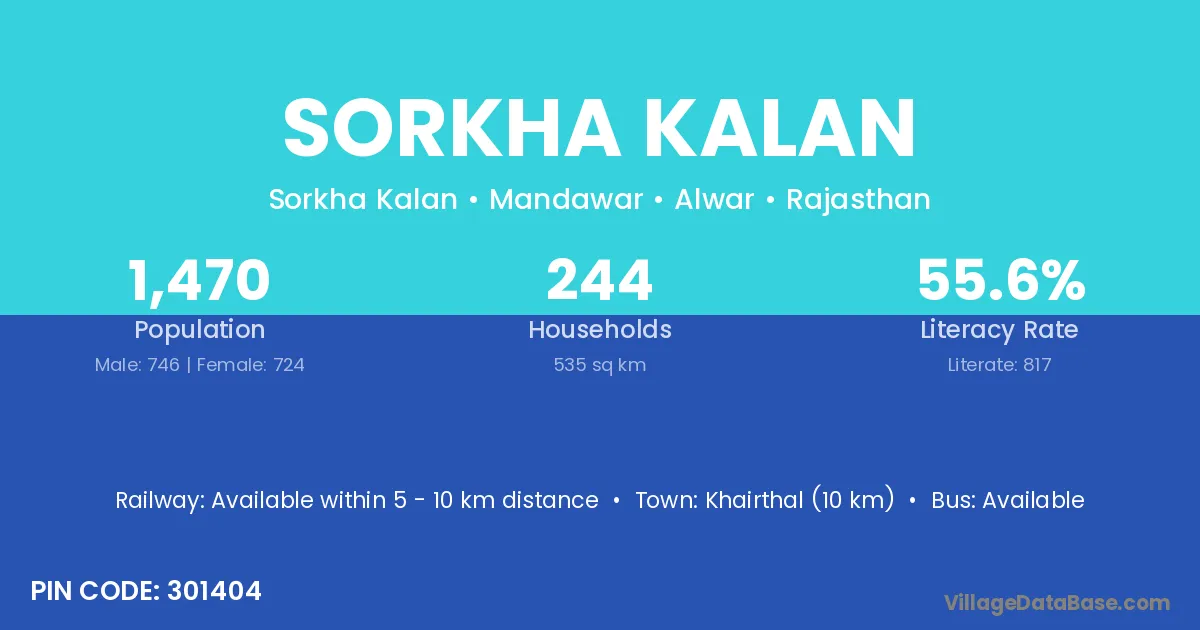 Khairthal (10 km) is the nearest town to Sorkha Kalan village for major economic activities and is located approximately 10 km away.