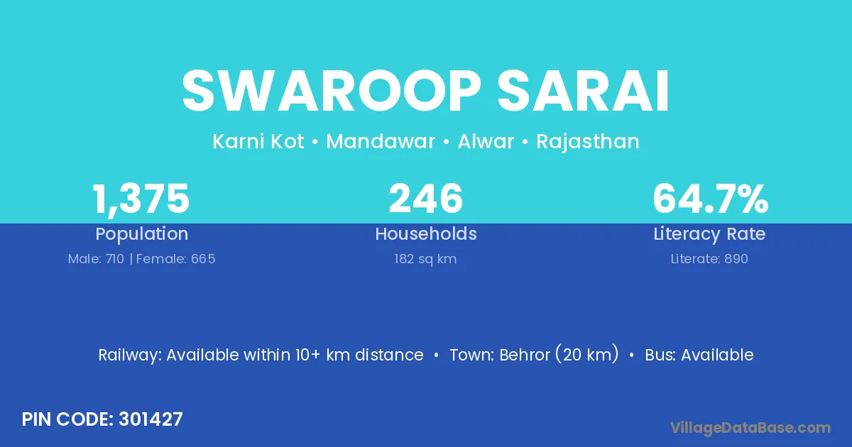 Behror (20 km) is the nearest town to Swaroop Sarai village for major economic activities and is located approximately 20 km away.