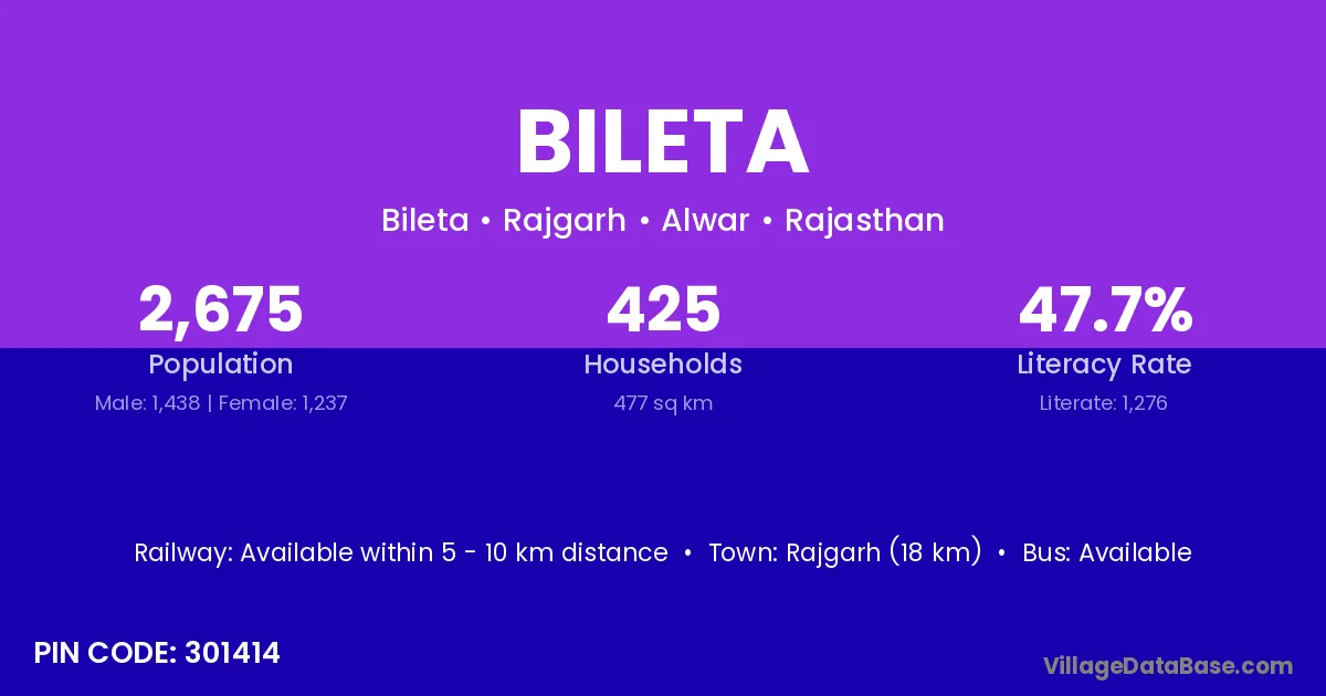 Rajgarh (18 km) is the nearest town to Bileta village for major economic activities and is located approximately 18 km away.