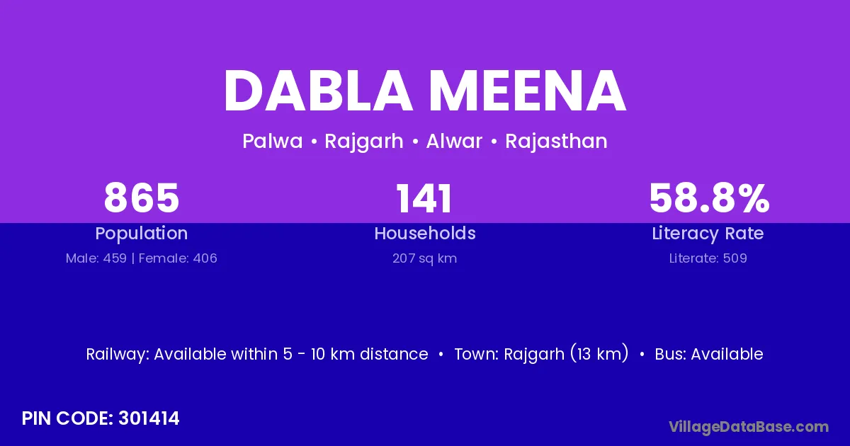 Rajgarh (13 km) is the nearest town to Dabla Meena village for major economic activities and is located approximately 13 km away.