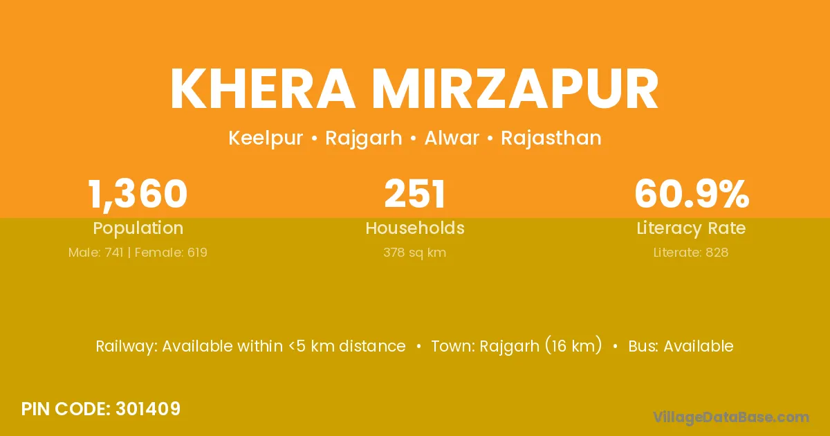 Rajgarh (16 km) is the nearest town to Khera Mirzapur village for major economic activities and is located approximately 16 km away.