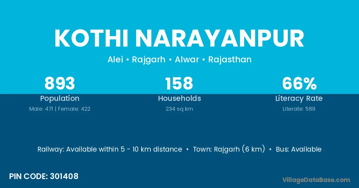 Rajgarh (6 km) is the nearest town to Kothi Narayanpur village for major economic activities and is located approximately 6 km away.