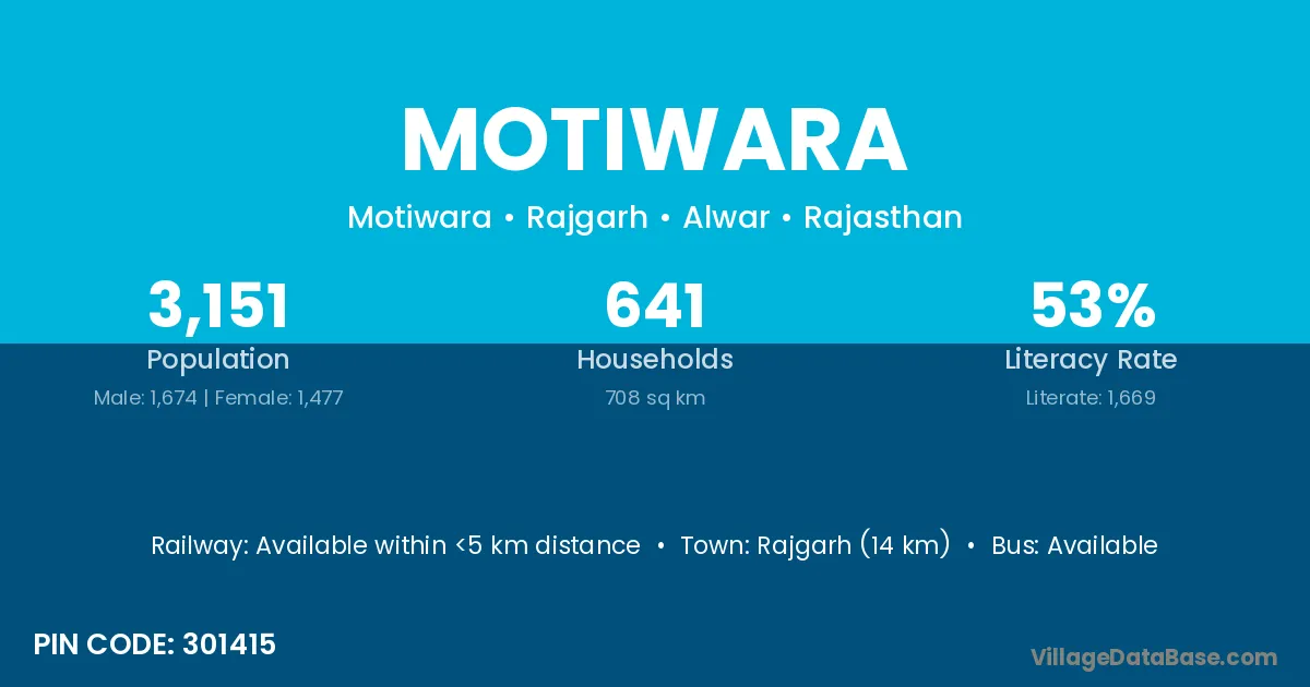 Rajgarh (14 km) is the nearest town to Motiwara village for major economic activities and is located approximately 14 km away.