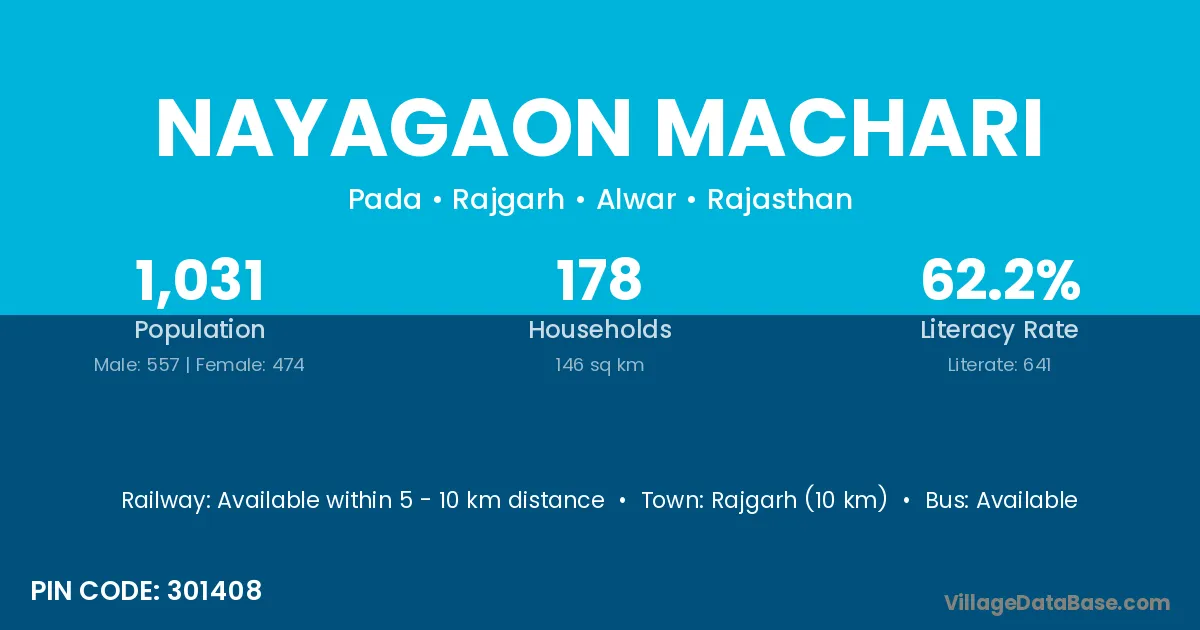 Rajgarh (10 km) is the nearest town to Nayagaon Machari village for major economic activities and is located approximately 10 km away.