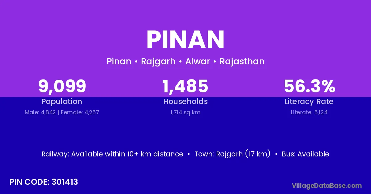 Rajgarh (17 km) is the nearest town to Pinan village for major economic activities and is located approximately 17 km away.