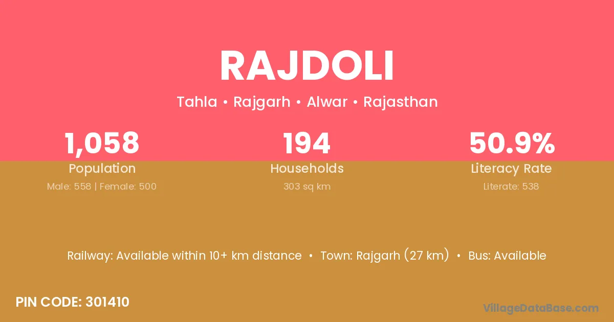 Rajgarh (27 km) is the nearest town to Rajdoli village for major economic activities and is located approximately 27 km away.