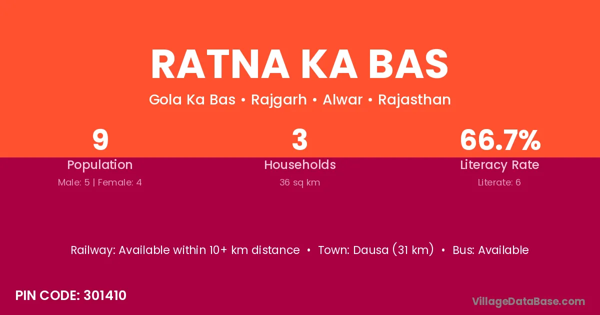 Dausa (31 km) is the nearest town to Ratna Ka Bas village for major economic activities and is located approximately 31 km away.