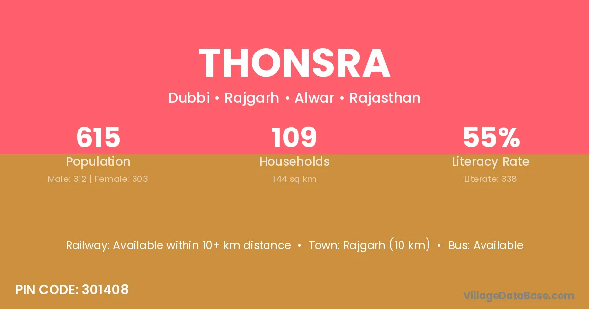 Rajgarh (10 km) is the nearest town to Thonsra village for major economic activities and is located approximately 10 km away.
