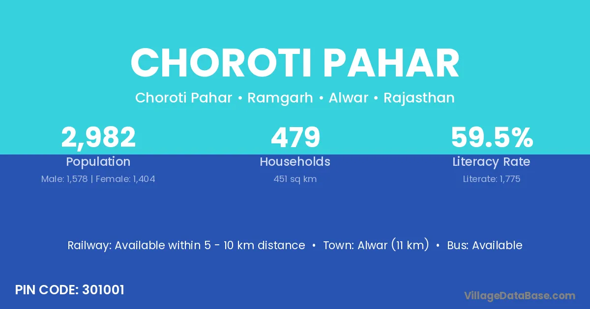 Alwar (11 km) is the nearest town to Choroti Pahar village for major economic activities and is located approximately 11 km away.