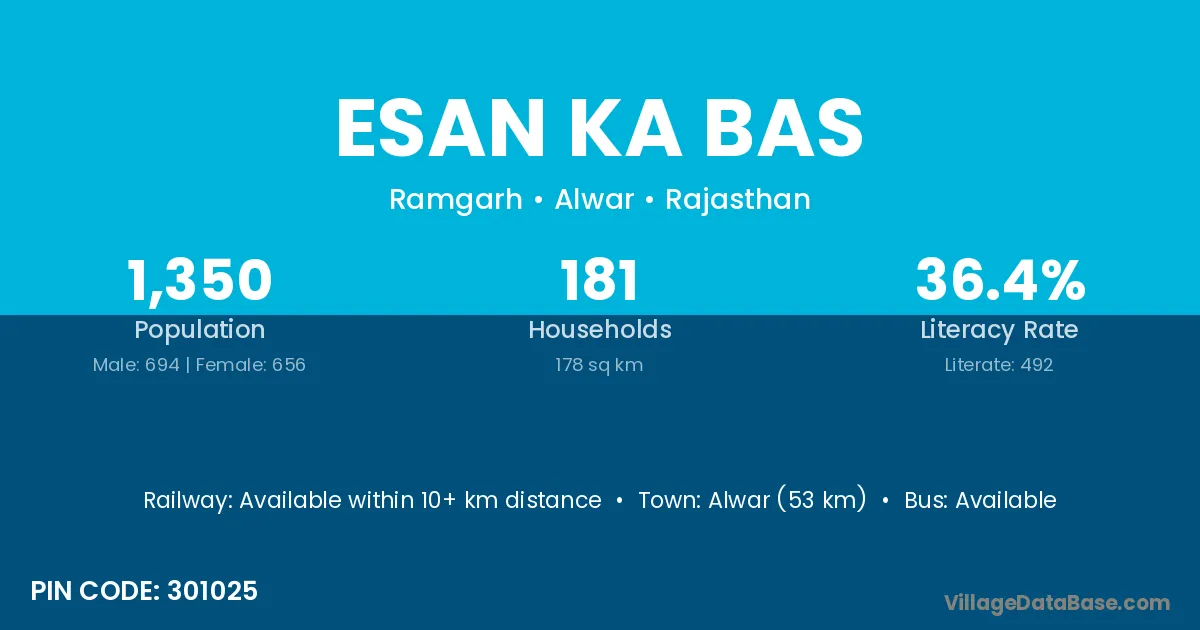 Alwar (53 km) is the nearest town to Esan Ka Bas village for major economic activities and is located approximately 53 km away.