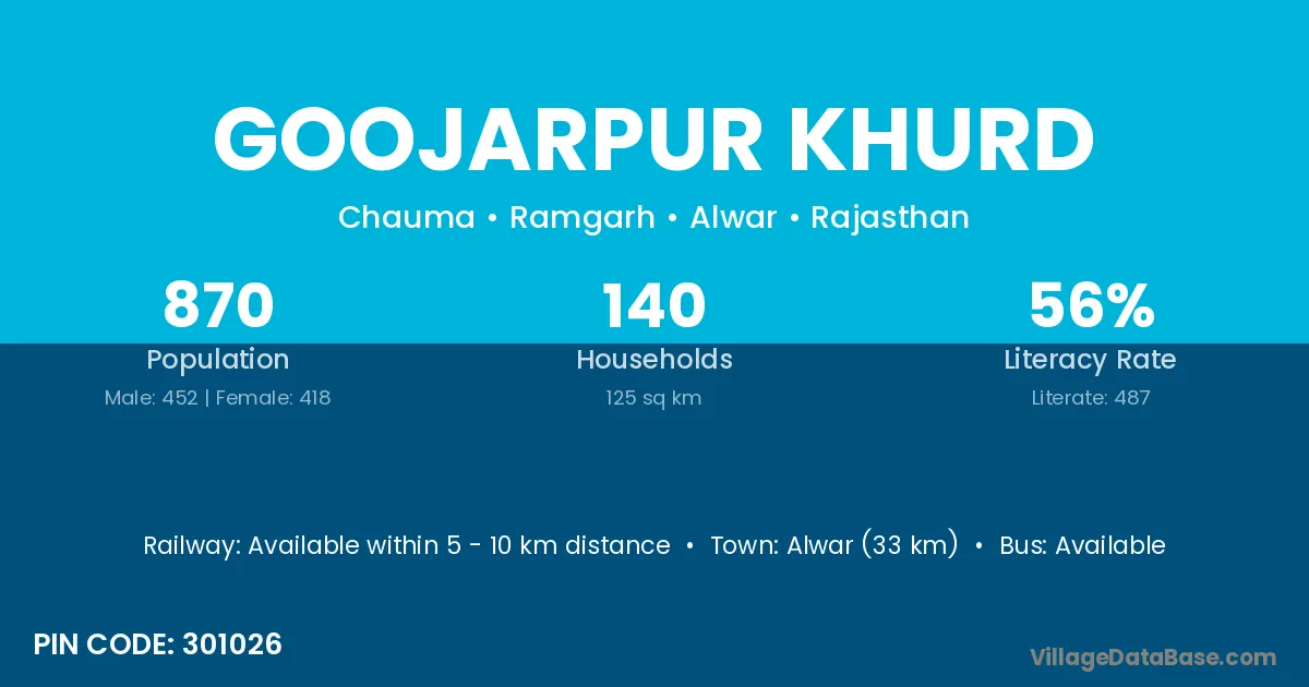 Alwar (33 km) is the nearest town to Goojarpur Khurd village for major economic activities and is located approximately 33 km away.
