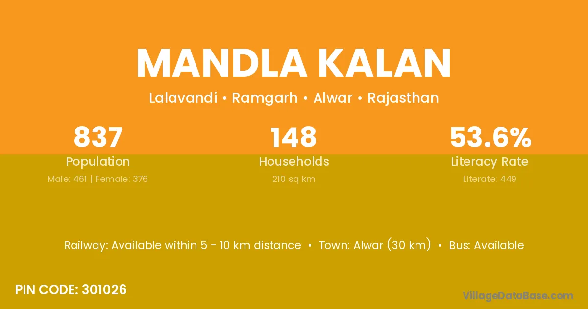 Alwar (30 km) is the nearest town to Mandla Kalan village for major economic activities and is located approximately 30 km away.