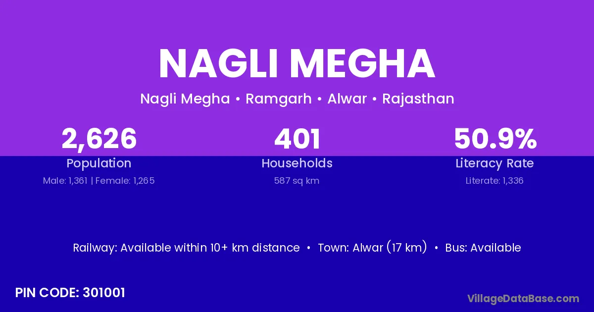 Alwar (17 km) is the nearest town to Nagli Megha village for major economic activities and is located approximately 17 km away.