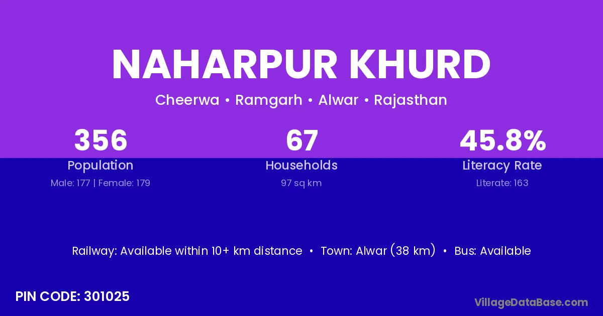 Alwar (38 km) is the nearest town to Naharpur Khurd village for major economic activities and is located approximately 38 km away.