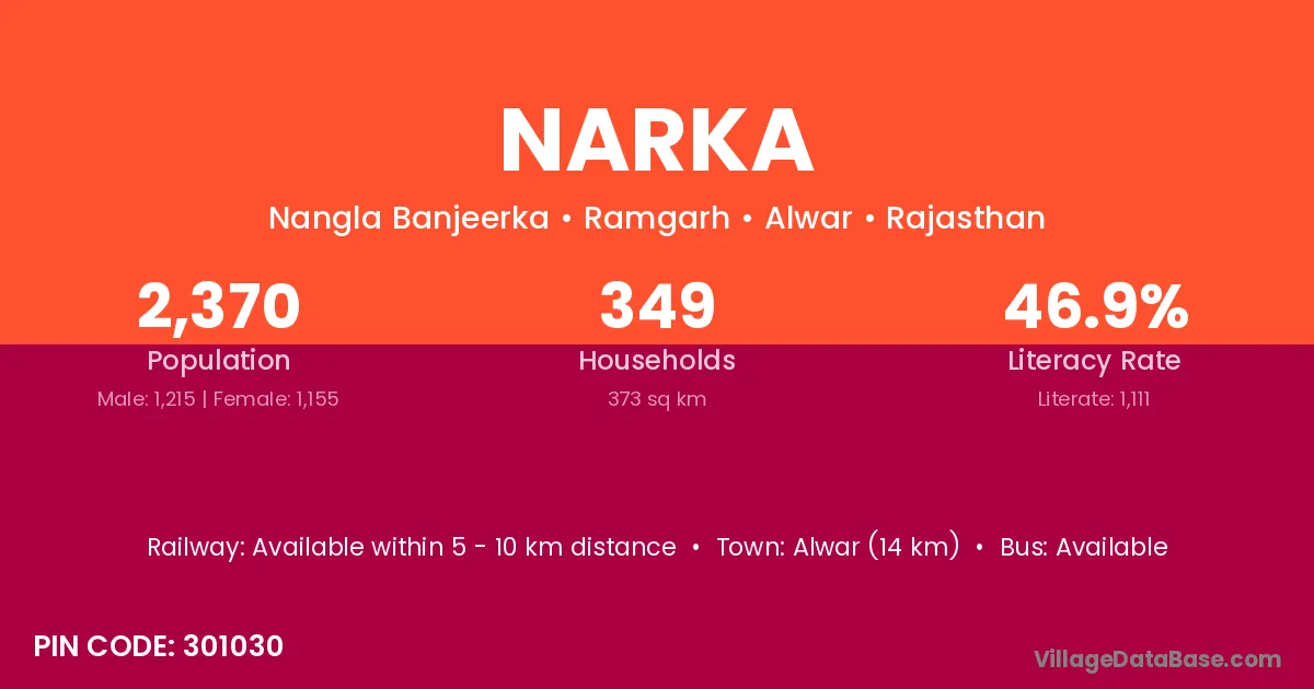 Alwar (14 km) is the nearest town to Narka village for major economic activities and is located approximately 14 km away.
