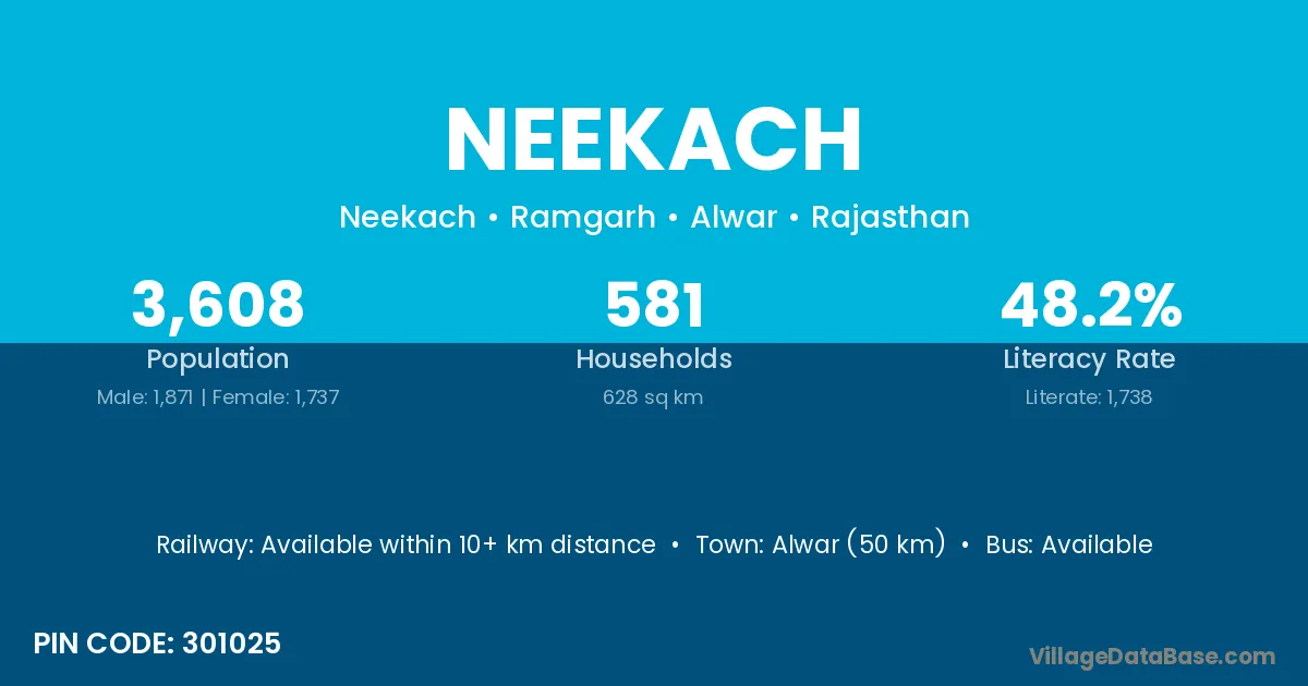 Alwar (50 km) is the nearest town to Neekach village for major economic activities and is located approximately 50 km away.