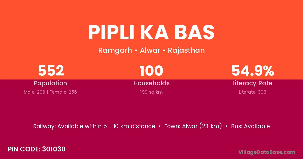 Pipli Ka Bas village has a total population of 552 people, of which 296 are males and 256 are females.