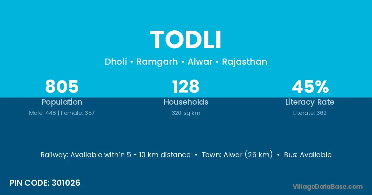 Alwar (25 km) is the nearest town to Todli village for major economic activities and is located approximately 25 km away.