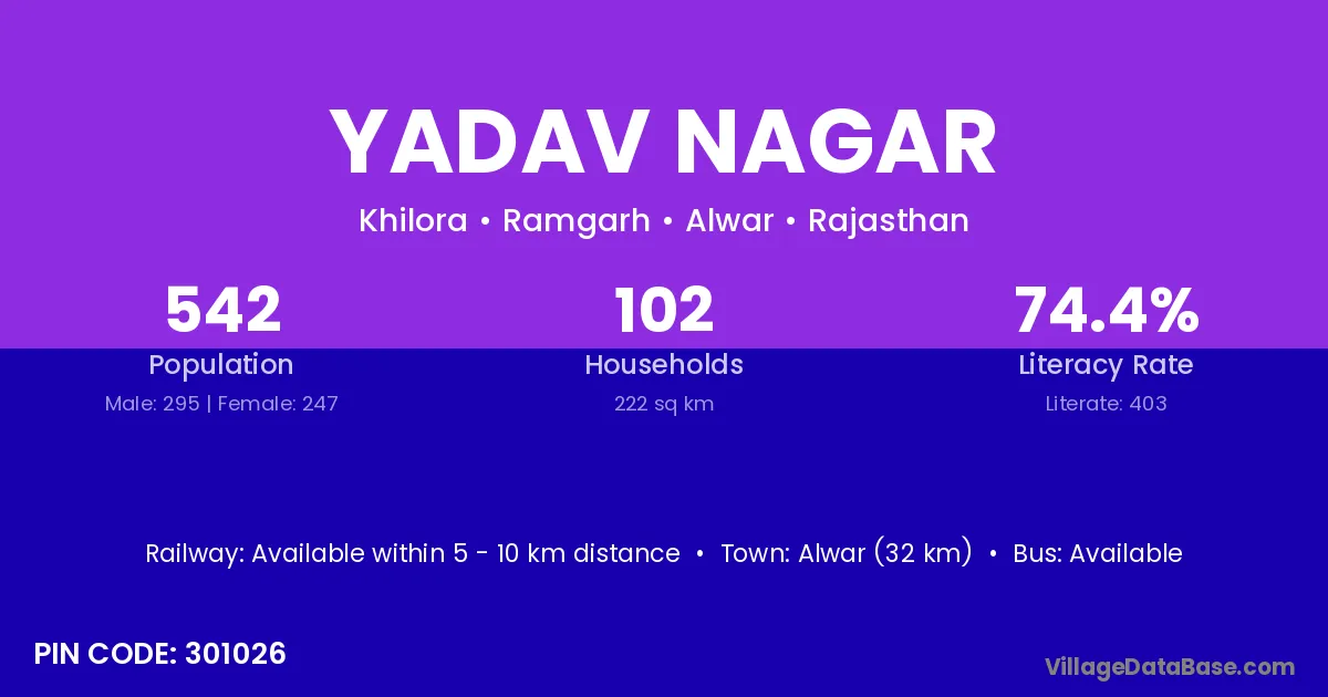 Alwar (32 km) is the nearest town to Yadav Nagar village for major economic activities and is located approximately 32 km away.
