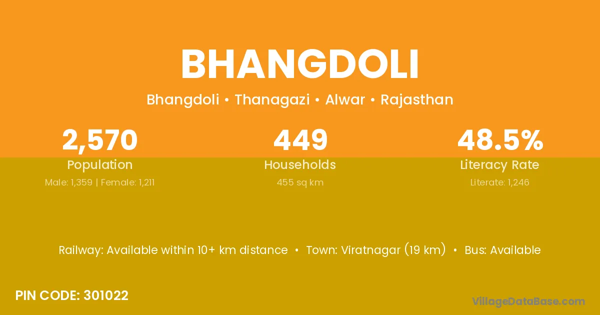 Viratnagar (19 km) is the nearest town to Bhangdoli village for major economic activities and is located approximately 19 km away.