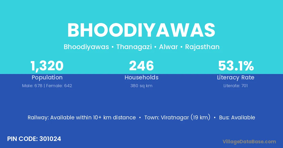 Viratnagar (19 km) is the nearest town to Bhoodiyawas village for major economic activities and is located approximately 19 km away.