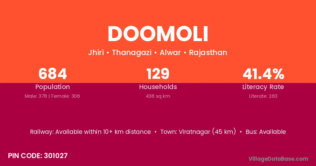 Viratnagar (45 km) is the nearest town to Doomoli village for major economic activities and is located approximately 45 km away.
