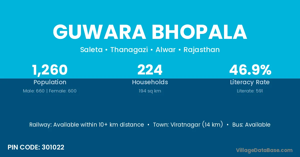 Viratnagar (14 km) is the nearest town to Guwara Bhopala village for major economic activities and is located approximately 14 km away.