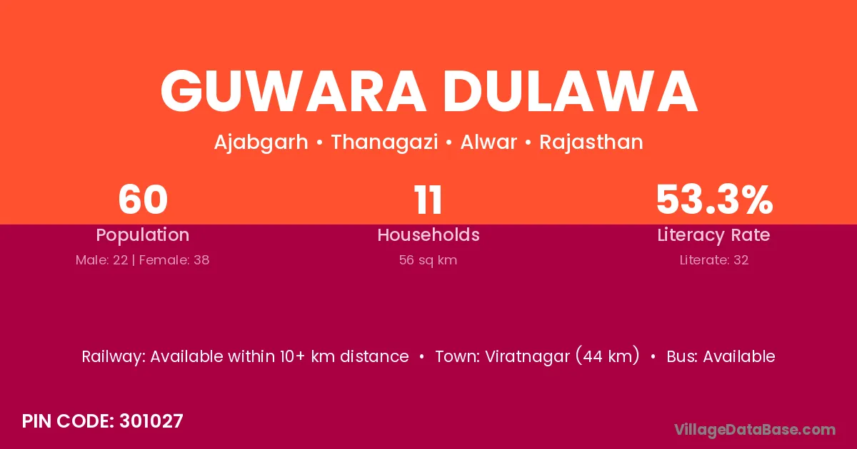Guwara Dulawa village has a total population of 60 people, of which 22 are males and 38 are females.