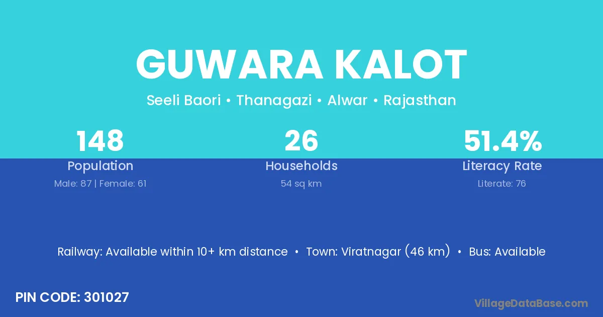 Viratnagar (46 km) is the nearest town to Guwara Kalot village for major economic activities and is located approximately 46 km away.