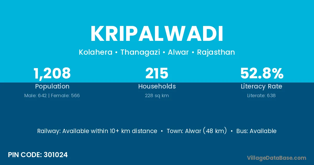 Alwar (48 km) is the nearest town to Kripalwadi village for major economic activities and is located approximately 48 km away.