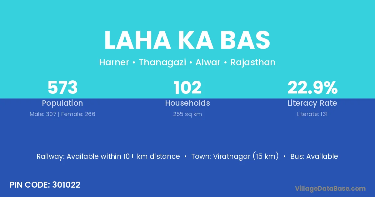 Viratnagar (15 km) is the nearest town to Laha Ka Bas village for major economic activities and is located approximately 15 km away.