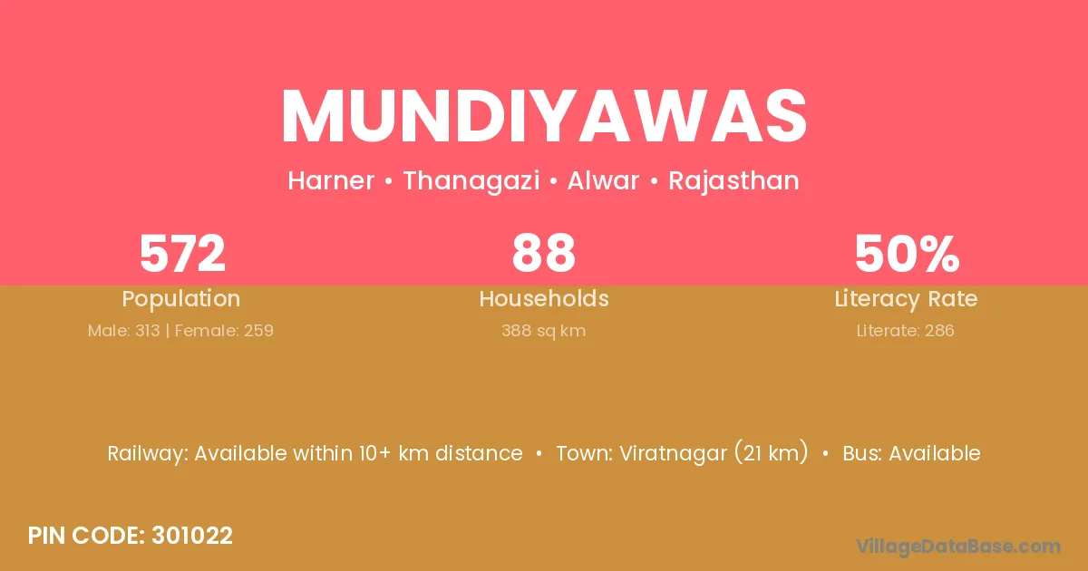 Viratnagar (21 km) is the nearest town to Mundiyawas village for major economic activities and is located approximately 21 km away.