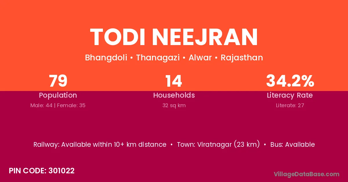 Viratnagar (23 km) is the nearest town to Todi Neejran village for major economic activities and is located approximately 23 km away.