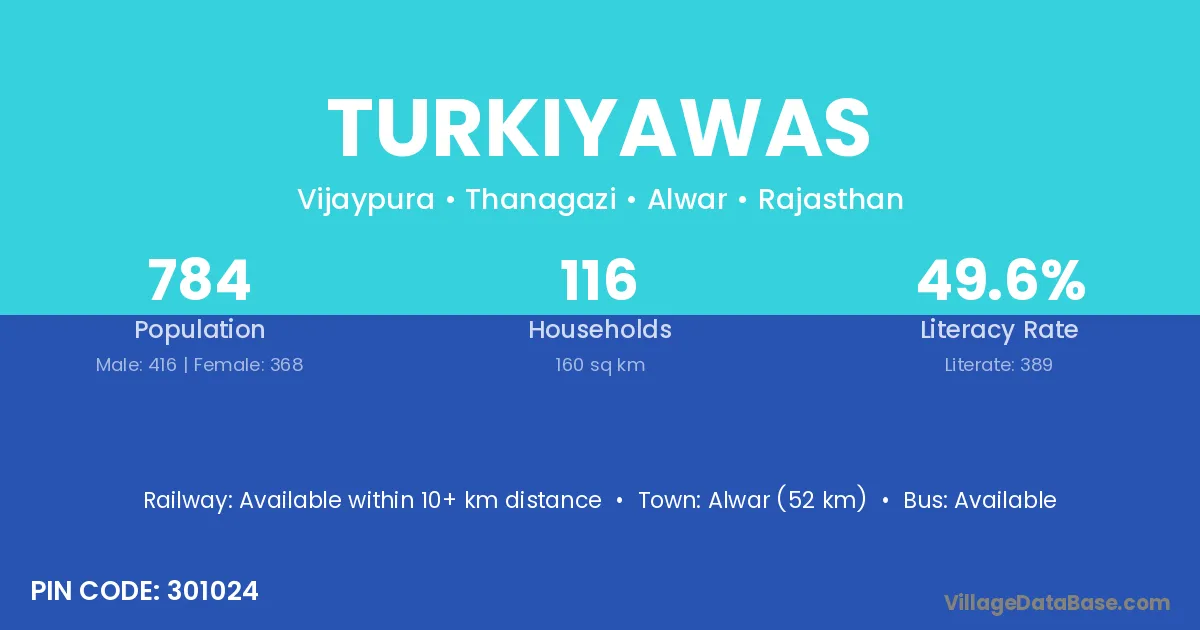 Alwar (52 km) is the nearest town to Turkiyawas village for major economic activities and is located approximately 52 km away.
