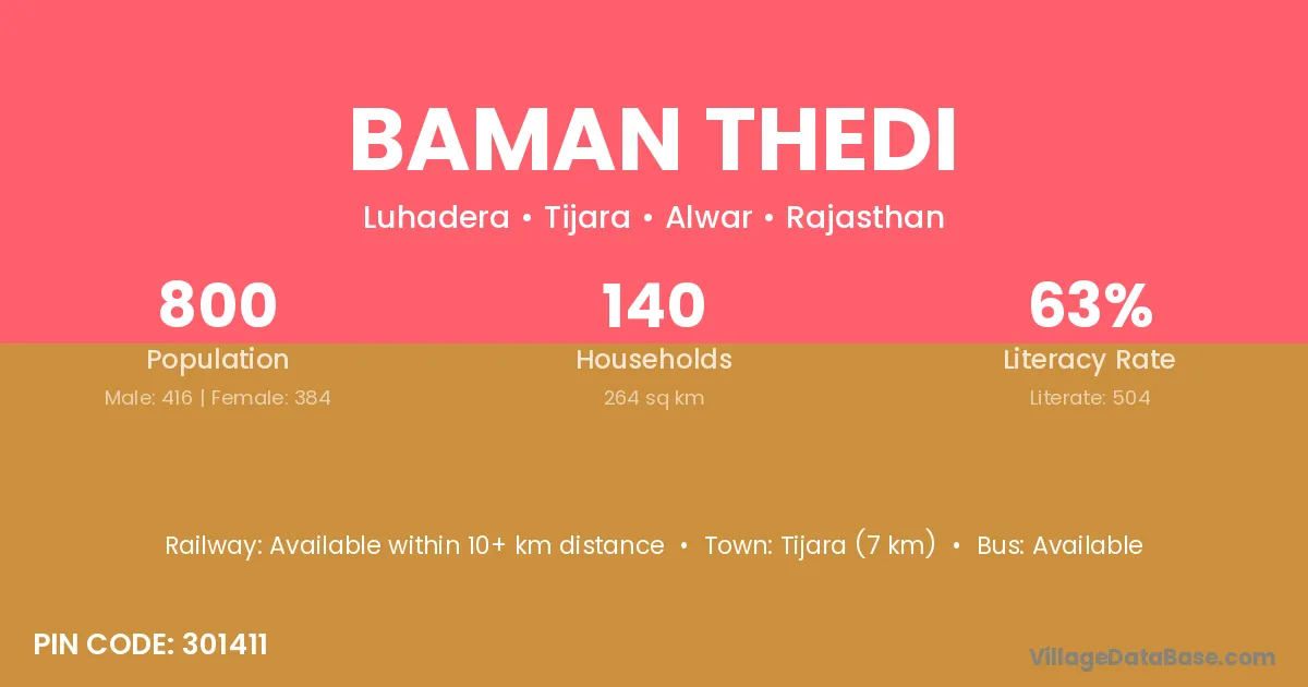 Tijara (7 km) is the nearest town to Baman Thedi village for major economic activities and is located approximately 7 km away.