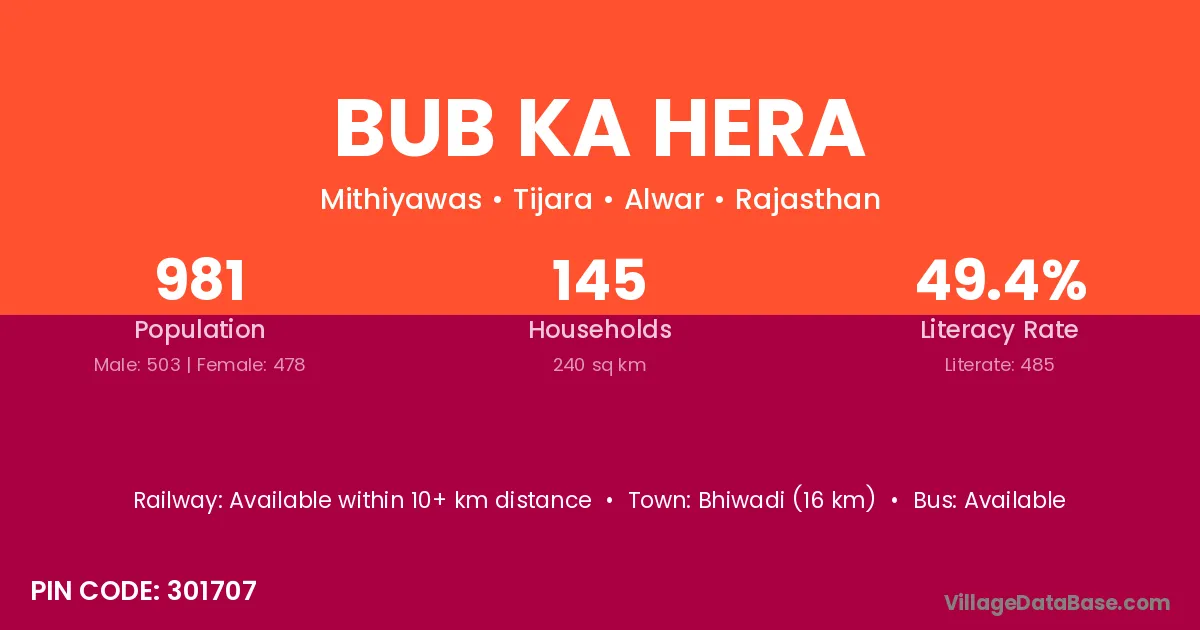 Bhiwadi (16 km) is the nearest town to Bub Ka Hera village for major economic activities and is located approximately 16 km away.