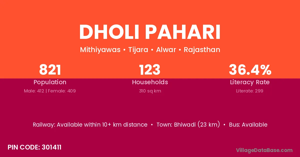 Bhiwadi (23 km) is the nearest town to Dholi Pahari village for major economic activities and is located approximately 23 km away.