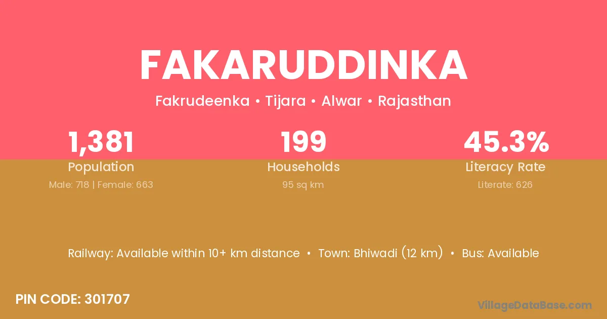Bhiwadi (12 km) is the nearest town to Fakaruddinka village for major economic activities and is located approximately 12 km away.