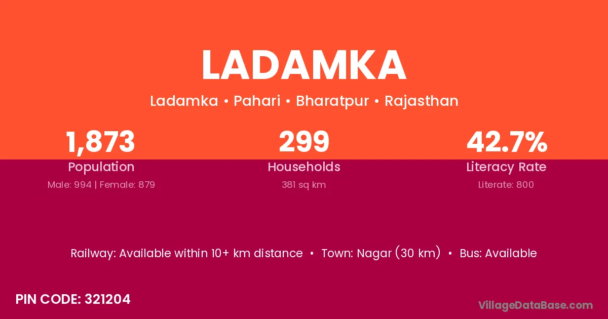 Bhiwadi (13 km) is the nearest town to Ladamka village for major economic activities and is located approximately 13 km away.