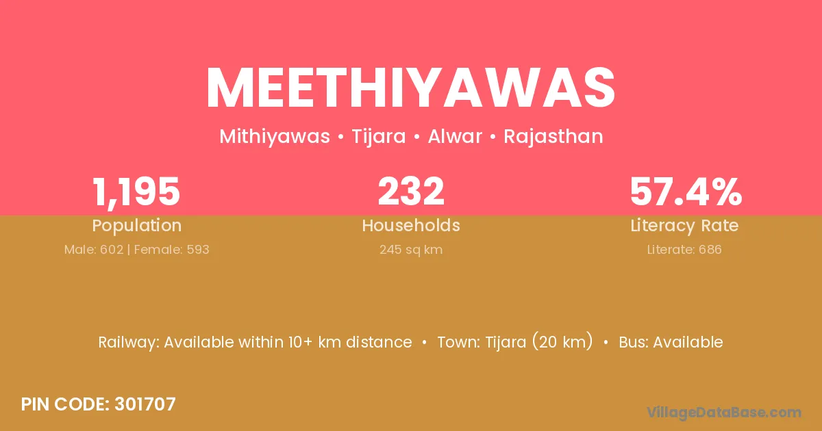 Meethiyawas village has a total population of 1,195 people, of which 602 are males and 593 are females.