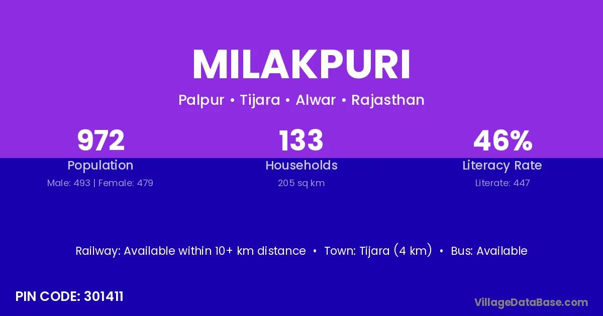 Tijara (4 km) is the nearest town to Milakpuri village for major economic activities and is located approximately 4 km away.
